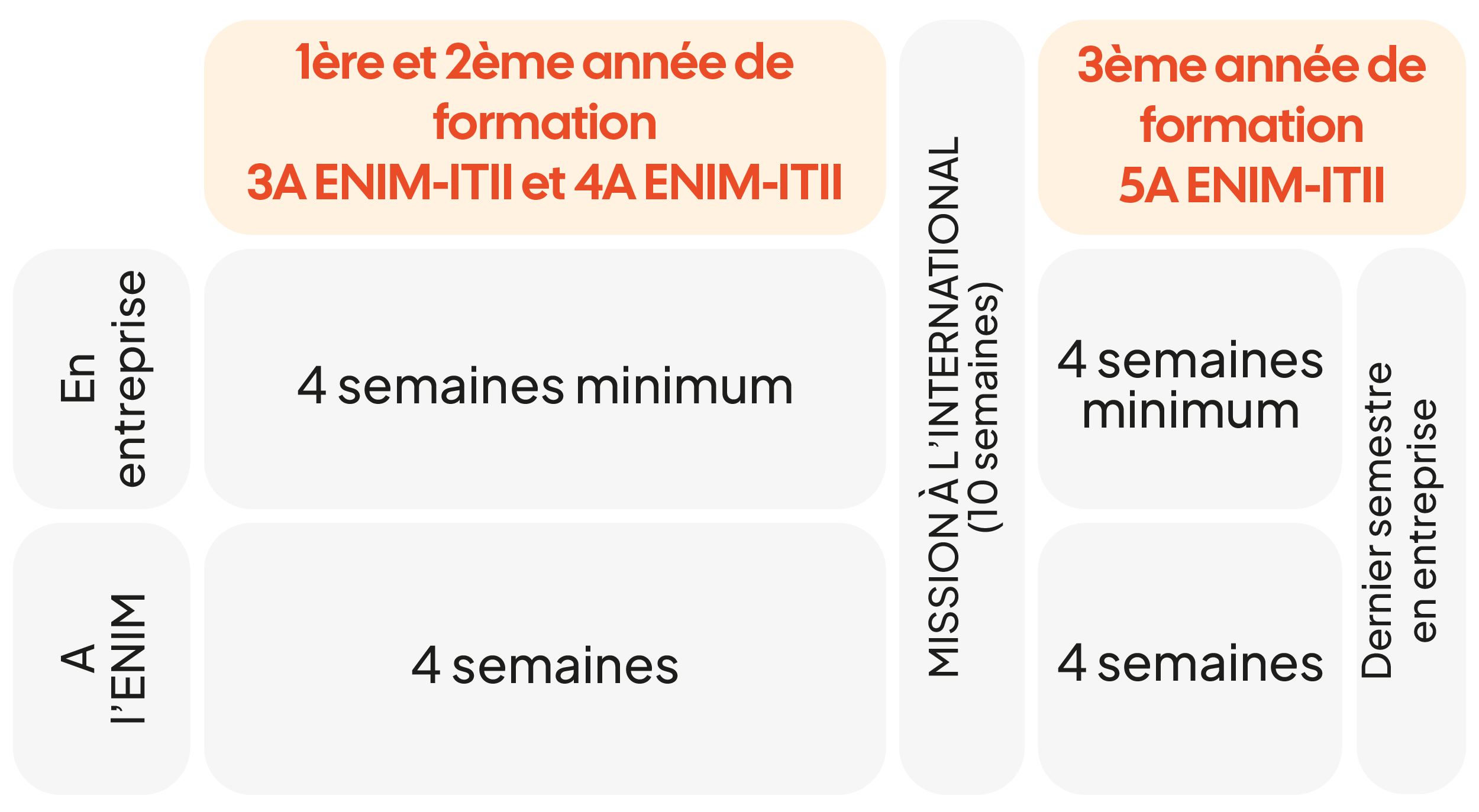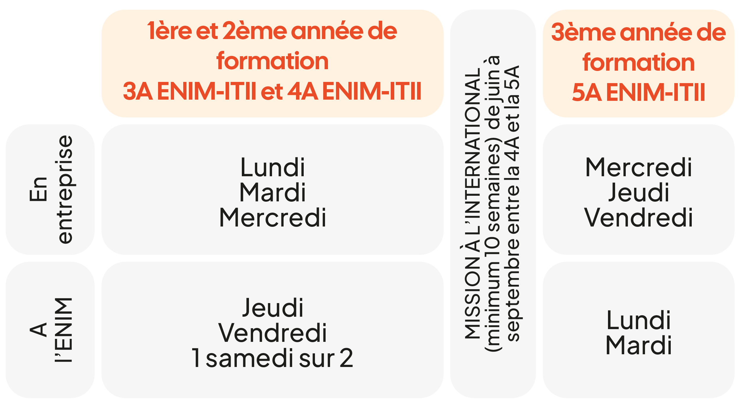 L'alternance longue (cycles de 8 semaines minimum : 4 semaines de formation à l'ENI de Metz puis 4 semaines minimum sur le site de l'entreprise.